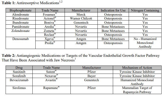 The American College of Prosthodontists agrees with the recommendation for the term, “Medication- Related Osteonecrosis of the Jaw (MRONJ)” suggested by the American Association of Maxillofacial Surgeons (AAOMS) to replace the previous, more-specific term, “Bisphosphonate-Related Osteonecrosis of the Jaw (BRONJ),” due to the increasing number of osteonecrosis cases resulting from the use of other antiresorptive and antiangiogenic therapies. For a comprehensive review of the pathophysiology, differential diagnosis, incidence, staging, and surgical management of MRONJ several references are suggested for review, but this topic is considered outside the scope of this position statement.1-3 The purposes of this position statement are threefold: