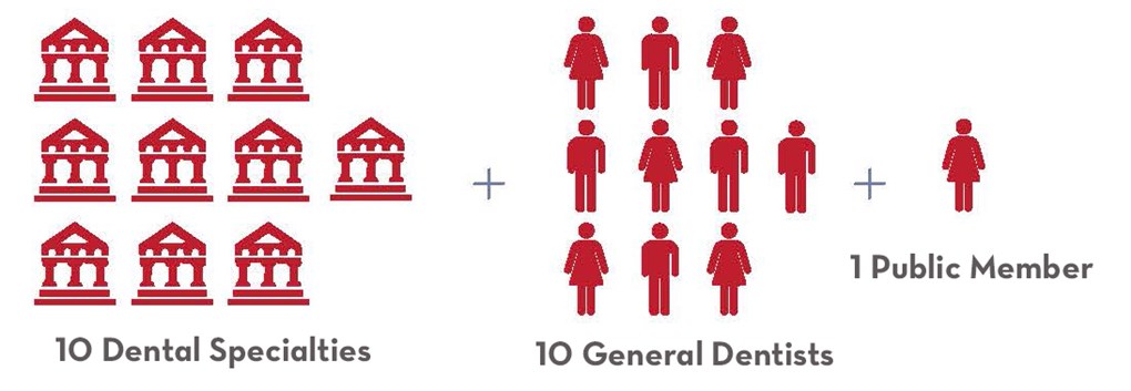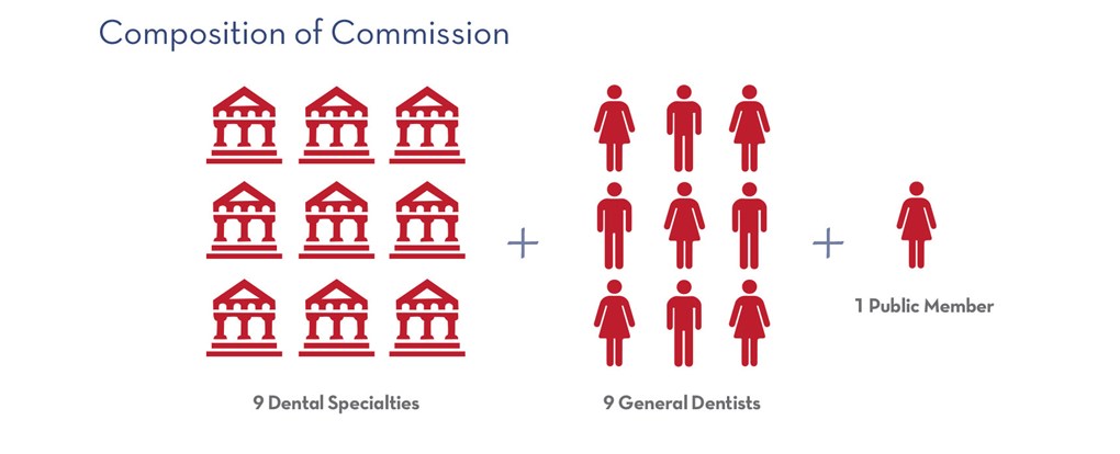 The Commission is composed of ten dental specialties, ten general dentists, and one public member. Members of the Commission serve one four-year term.