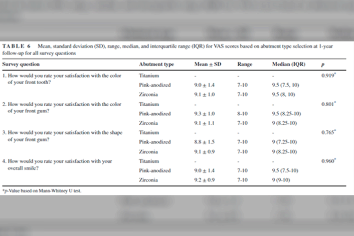 Vazouras K, Gholami H, Margvelashvili-Malament M, et al. An esthetic evaluation of different abutment materials in the anterior maxilla: a randomized controlled clinical trial using a crossover design. J Prosthodont 2022; 1- 8. https://doi.org/10.1111/jopr.13520