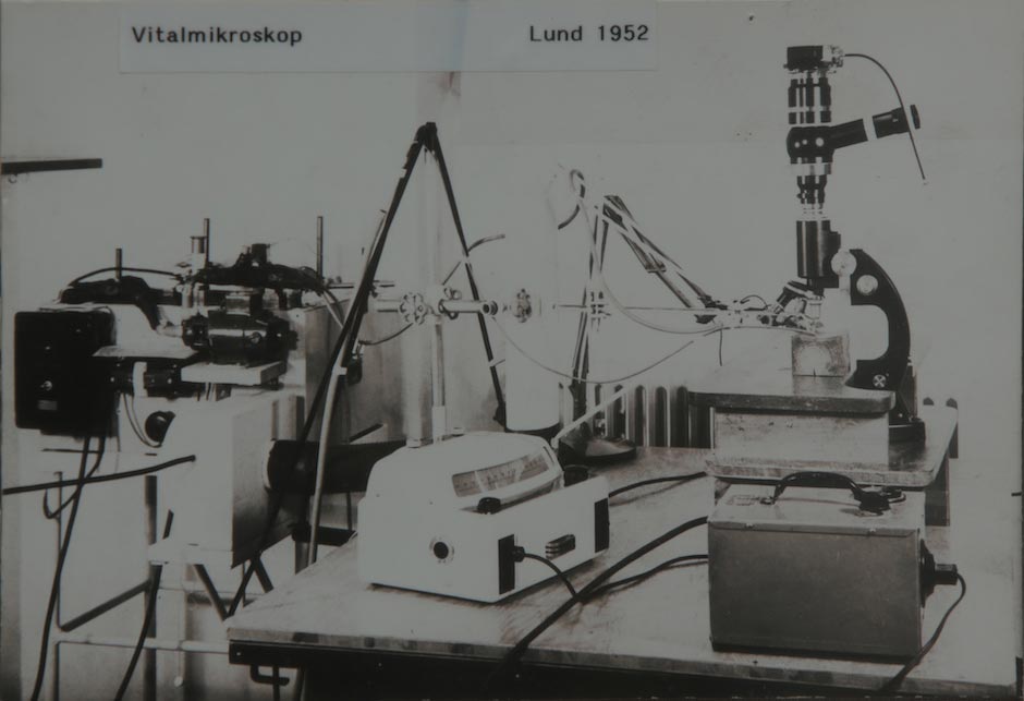 This image is of the special vital microscopy equipment used in P-I Brånemark's research. It was used with the glass chambers for rabbits and later for humans.