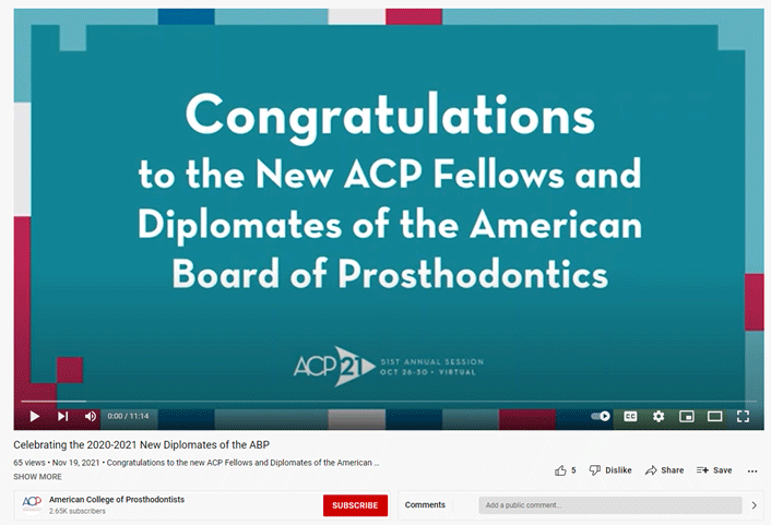 The video features special messages or photos from all ACP members who completed their board certification with the American Board of Prosthodontics in fall 2020 and spring and summer 2021. Board certification is a prerequisite for the status of Fellow of the American College of Prosthodontists.