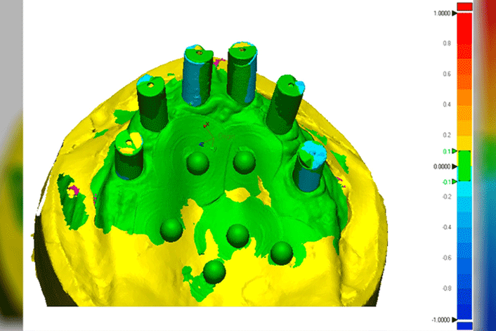 Twenty-seven patients (36 edentulous jaws) were treated with one-piece, screw-retained implant-supported fixed complete dental prostheses. Twenty-one jaws (21) were maxillary, and 15 were mandibular. Full-arch conventional impressions and intraoral digital scans with scan bodies and an intraoral scanner were taken during the impression phase. Following verification of the conventional stone casts, the casts were digitized. The generated STL files from both impression techniques were merged and analyzed with reverse engineering software.