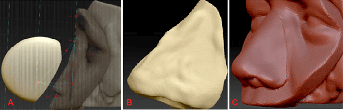 Contemporary digital technologies have been integrated in prosthetic procedures reconstructing missing facial parts, specifically ears. Digital skin reproduction and 3D scanners and printers have been reported to enhance ear shape and color reproduction. However, the application of digital technologies is still partial, and the final prosthetic ear is usually manufactured conventionally using stone molds. Also, some of these technologies cannot be applied to nose reconstruction, as there is no existing part to mirror as in the case of a unilateral ear.