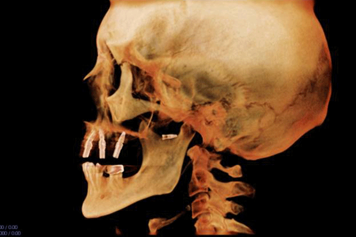 When the patient was seen two weeks later for follow-up, she reported pain on her left side and limited mandibular opening. She was referred to a radiology team who determined that the dental implant was in close proximity to vital anatomical structures, including, the carotid artery, and was at risk of migration into these structures. The patient underwent surgery by the interventional radiology team and the implant was removed.