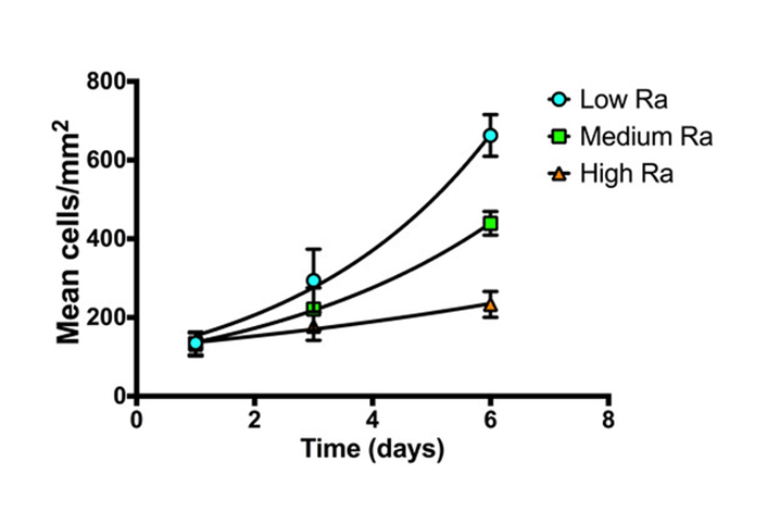 PICN is now marketed for fabricating full‐contour implant‐supported crowns and studies have shown it not to be cytotoxic. Surface roughness is a component of biocompatibility affecting host cellular adhesion and proliferation across a material surface, and potentially adverse bacterial colonization. This study aimed to determine if PICN surface roughness would affect cell growth.