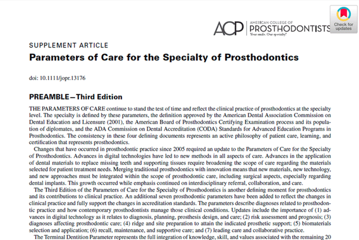Earlier this summer, the American College of Prosthodontists published the 'Parameters of Care for the Specialty of Prosthodontics.' The specialty is defined by these parameters, which you can read in full in the Journal of Prosthodontics or at Prosthodontics.org.