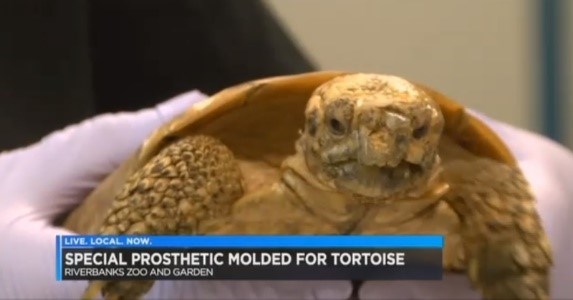 Dr. Nichols helped the Riverbanks Zoo by fabricating a prosthetic for a 30-year-old pancake tortoise named Blueberry. The maxillary obturator she crafted was needed to fill a hole that spans from Blueberry's sinuses into the roof of his mouth, most likely the result of sparring with another tortoise.