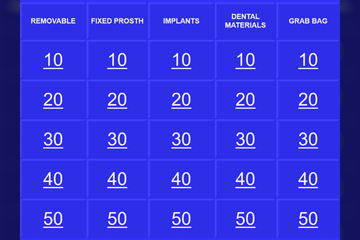 Prosthodontic Jeopardy is now available as a resource you can use to celebrate NPAW 2022. This resource, contributed by NPAW Committee Member Dr. Roberta Wright, is an interactive Power Point presentation that includes questions regarding the specialty. This would be perfect for events to actively engage residents, general dentists or dental students in a friendly competition that tests the knowledge of the nuances of prosthodontics.